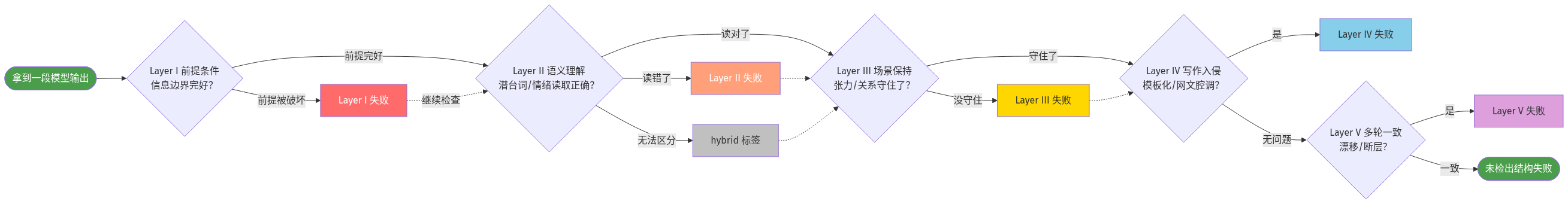 A diagnostic taxonomy of 78 labeled failure types across 5 layers for LLM-generated fictional and roleplay dialogue, with emphasis on Chinese-language scenarios. Covers preconditions, semantic reading, scene preservation, writing intrusion, and multi-turn consistency — each label with definition, observable criteria, and concrete examples. Designed as a shared diagnostic vocabulary for QA annotation, prompt optimization, and model evaluation.